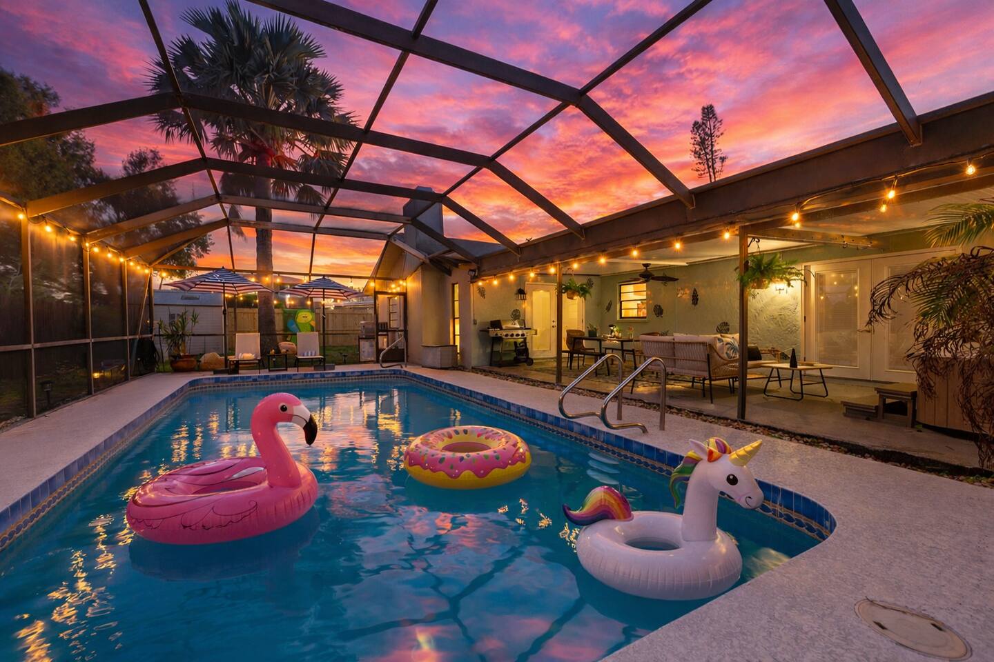 🌴 Family & Pet Friendly with Heated Pool, Hot Tub & Epic Game Room 🎮 Come stay in the place my 8-year-old swears is “the coolest” and asks, “Why don’t we live here full-time?” Perfect for families, intergenerational gatherings and everything in between. 🏡 The Space Private Fully fenced in 3BR / 2BA single level home with room to spread out: * Heated in-ground pool * 5-person hot tub * Dedicated air conditioned game room * 3 lounge areas: living room, media room & game room couch * Fully fenced in yard offers privacy and security. Screened in pool has a doggy door! * 4 flat screen TVs 📍 Location Highlights Centrally located near beaches, attractions & great food: * Anna Maria Island: **8.5 mi** * Holmes Beach: **8 mi** * Siesta Key: **19 mi** * Downtown Sarasota: **13 mi** * IMG Academy: **3.2 mi** * Ringling Museum: **8.6 mi** * Amazing Thai food: **2 mi** * Best homemade ice cream: **4 mi** 💤 Sleeping Arrangements 🛏️Bedroom 1 – King Ensuite * King bed, walk-in shower * Desk + chair (perfect for remote work) * Roku TV, charging station, 2 large closets * 2 bathrobes and 2 yoga mats *Pack n play travel crib, baby bathtub, and high chairs stored in closet 🛏️ Bedroom 2 – King Room * King bed, Roku TV * Full closet, dresser, charging station *2 bathrobes 🛏️ Bedroom 3 – Kids’ Bunk Room * Twin bunkbed + daybed with trundle * Sleeps 4, dresser in closet 🛁 Hall Bath * Tub, bidet & plenty of storage *Public Goods bath amenities 🛋️ Living & Entertainment Spaces * Open living/dining area with **cathedral ceilings** * Dining table for 8 (high chairs available) * Media room with **65” Roku TV** & tons of family friendly board games * Cozy stone fireplace (decorative) 🎯 Game Room (Converted Garage with A/C) A kid (and adult) favorite: * Nugget couch & swing chairs * Ping pong / air hockey table * Kids art & puzzle station * Karaoke machine & dress-up costumes * Nex Playground gaming console with full subscription-augmented reality on screen fun that gets everyone moving while playing on the TV screen (50+games) *Laser lights 🌐 Work-Friendly * FAST 1GB fiber WiFi * Boosters throughout the home * Dedicated workspace in primary bedroom 🌞 Outdoor Oasis Screened lanai with: * Heated pool & hot tub * Outdoor dining * Multiple lounge areas (chaises, rockers, couches) *Doggy door Outdoor fun includes: * Corn hole * Giant Connect Four * Velcro putting green * Brand-new propane grill 🏖️ Beach & Pool Gear * Beach umbrellas * Turkish beach towels that won't trap sand * Cooler *Picnic blanket * Beach chairs * Pool/beach toys & outdoor games ☕ Coffee Lovers Welcome Full coffee & tea station: * Ground + whole bean coffee (grinder included) * French press, electric kettle * 12-cup & single-serve coffee makers * Separate K-cup machine * Assorted teas & hot cocoa 🍳 Fully Stocked Chef’s Kitchen Includes: * Stainless steel appliances * Air fryer/toaster oven * Waffle maker & blender * Cooking basics: oils, spices, sugar, creamers, foil & more *Cookware and bakeware so you can make a feast * We are happy to accommodate any guests who keep Kosher, with a separate set of cutlery and dinnerware to be swapped in for your stay, just ask! 🔑 Guest Access Guests enjoy full access to the home, except for two locked owner closets so we can keep the place fully stocked for you A detailed guest manual is provided with house info and local recommendations. Full laundry room with washer, dryer and extra fridge/freezer. Detergent pods along with steamer, iron and ironing board are located in this room. A starter pack of paper goods (toilet paper and paper towels) are provided for each stay. 3 rolls per bathroom (total 6 rolls) and 2 paper towel rolls.